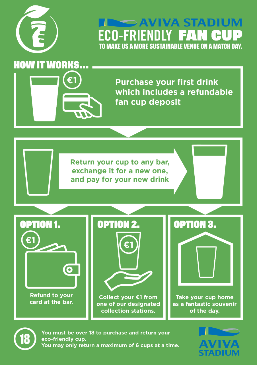 - Only when you return your final used cup – without wanting to purchase any further pints will you then be redeemed the €1 deposit you paid at your first purchase